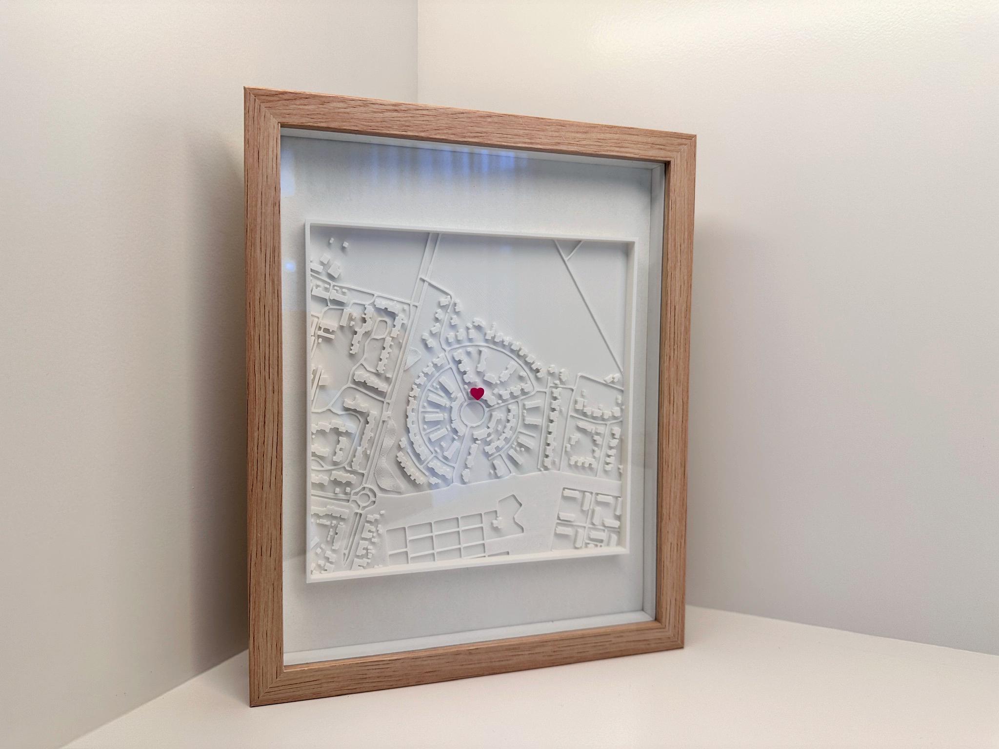 Geef je interieur een persoonlijke touch met een uniek gepersonaliseerd 3D-geprinte kaart van jouw adres, stijlvol ingelijst in een fotolijstje. Dit bijzondere cadeau is perfect voor een huwelijk, verjaardag, jubileum of samenwonen, en zal zeker indruk maken op iedereen die het ontvangt. Door een specifiek adres om te zetten in een tastbaar 3D-ontwerp, breng je dierbare herinneringen tot leven op een prachtige manier.
